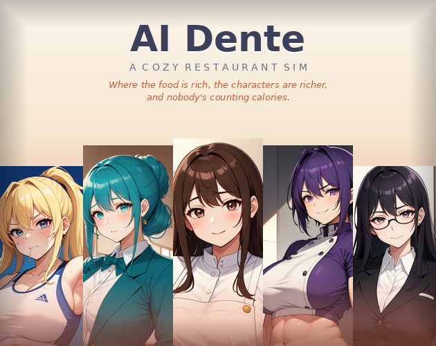 Hello! I'm a long term lurker who wanted to try and give back to the community in some form. I built the game entirely using Claude, but even thought it's AI slop I hope you're able to get some enjoyment out of it. This first release is a proof of concept more than anything, but my hope is that if I continue development. **AI Dente** is a cozy, campy restaurant management sim crossed with a visual novel. Run your dream restaurant, cook with style, and get to know the people who make it special.