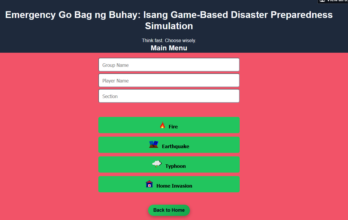 Emergency Go Bag ng Buhay is a browser-based disaster preparedness simulation designed for NSTP–CWTS students—where learning meets real-life survival decisions. Step into high-pressure scenarios like fires, earthquakes, typhoons, and home emergencies, and test your ability to think fast and act smart.
