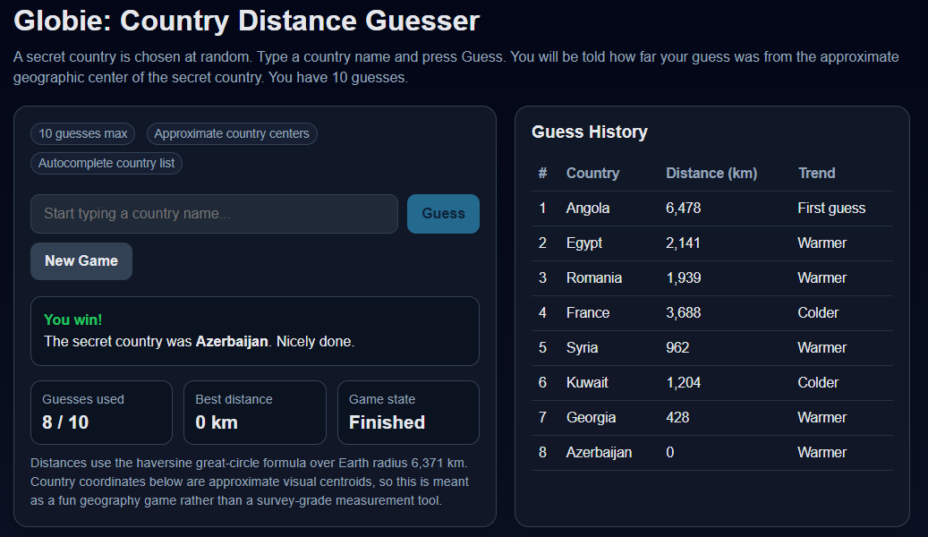 Globie is a pure geography puzzle game that strips everything down to logic and intuition. No maps. No Street View. No visual clues. Just your knowledge of the world, and your investigative ability. At the start of each game, a random country is secretly selected. Your job is to find it in 10 guesses or less.