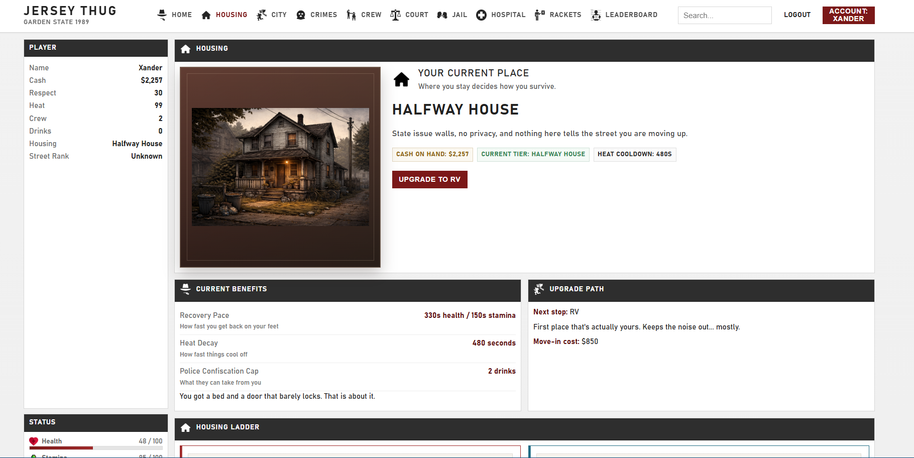 Jersey Thug is a browser-based crime strategy game set in 1989 Camden, New Jersey . You start as a nobody with no crew, no protection, and no real way out except hustle, pressure, and smart decisions. Every move affects your rise. Push too hard and you build heat. Slip up and you can end up broke, beaten, or sitting in a cell.