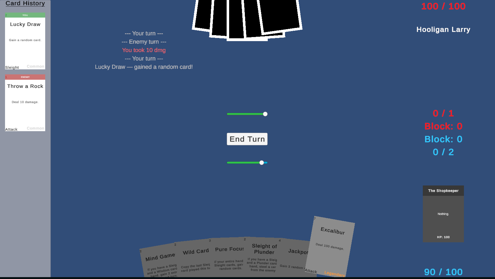 Karthan is a roguelike card game where you run a card shop by day and duel by night. The current goal is to survive 10 days while not going bankrupt as the increasing rent catches up to you. Each morning you set up your stands and wait for customers to browse. You want to price them right so they'll buy, price too high and they'll walk out. Serve customers at the register before their patience runs out.