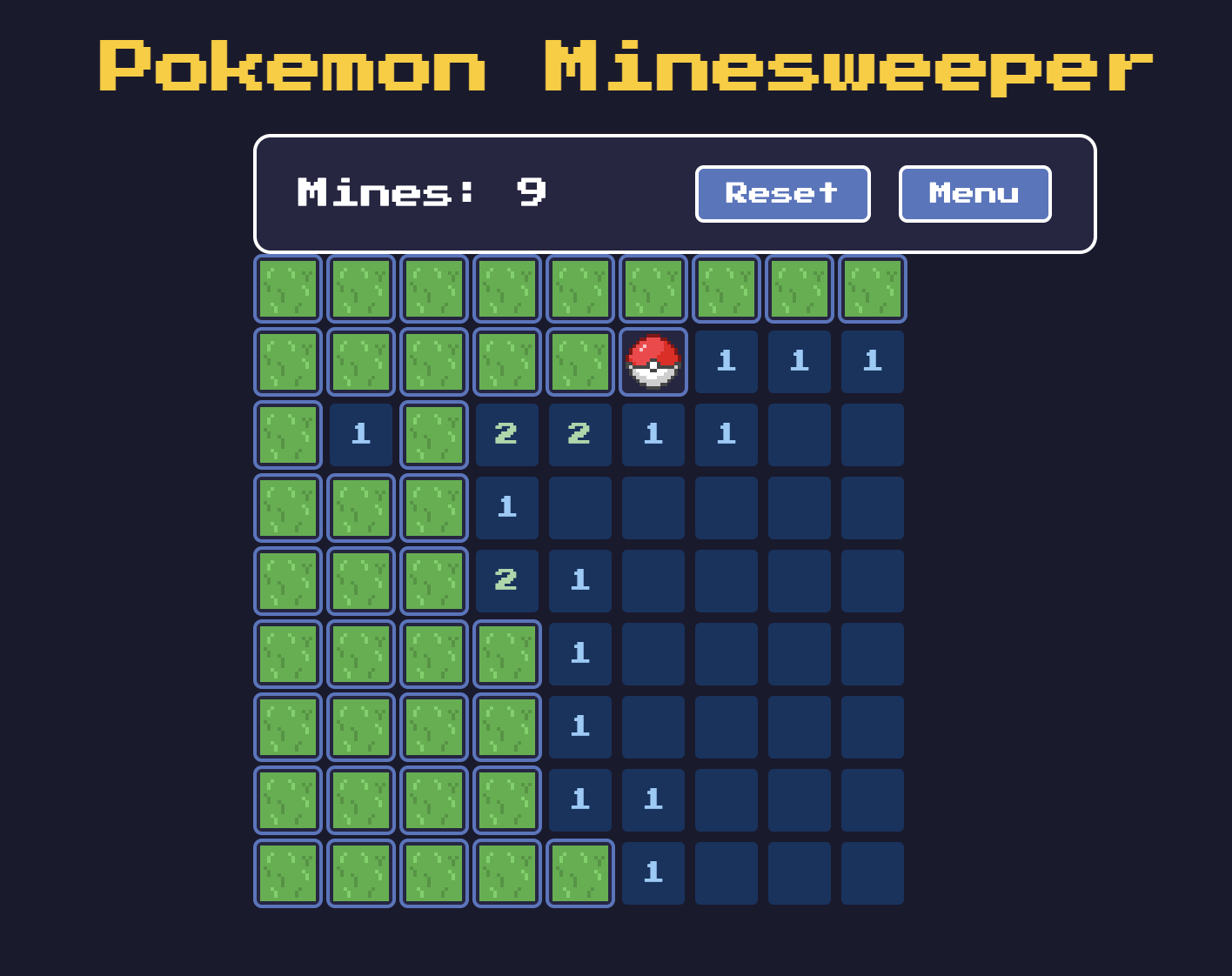The title is a tell-all! Instead of bombs, avoid the Pokémon hiding in the grass. Instead of flagging squares, placed down Pokéballs! The rest of Minesweeper's rules apply here. Bo