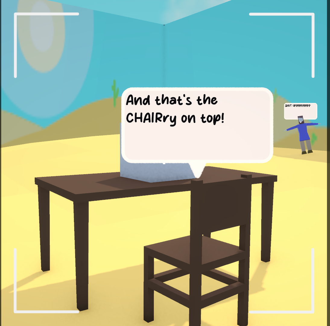 Do YOU want to make movies worthy of an oscar? Dominate the box office? Well, this game is just for you. Press E while hovering on a character/prop to give it dialogues.